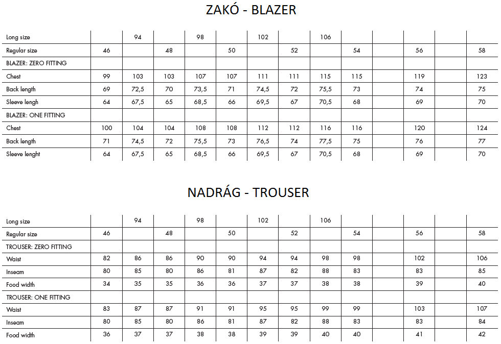 Size tables