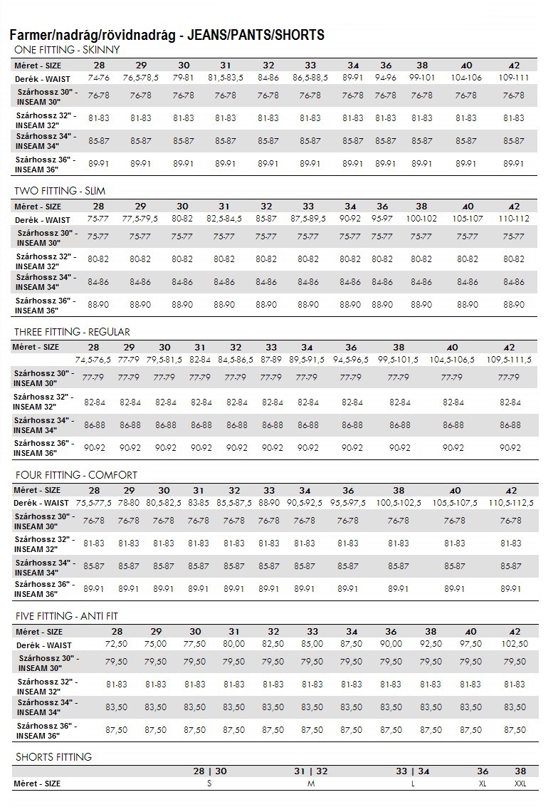 Jeans and pants sizes